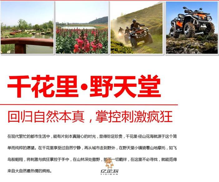 【轻拓休闲】跨上ATV全地形车,在山林深处放肆张扬、在花海丛中穿梭,用一颗骑士之心与世界相处 [复制链接] 花花 发布于2018-08-23 11:25 1897 0 分享到 在现代繁忙的都市生活中,能有片刻本真随心的时光,显得弥足珍贵,千花里·径山花海就源于这个简单而纯粹的愿望。在千花里享受过自然宁静,再从城市走到野外,在野天堂小镇骑着山地摩托,如飞鸟般翱翔,将刺激与疯狂掌控于手中,在山林深处撒野,抛下一切羁绊,在这里不必寻找,就能觅得来自大自然最热情的拥抱。