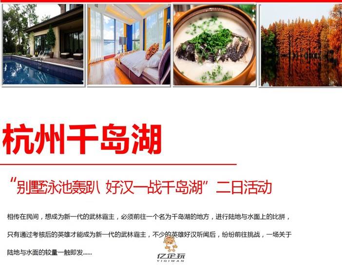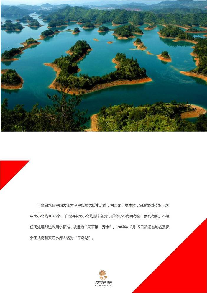 【轻拓休闲】杭州千岛湖“别墅泳池轰趴 好汉一战千岛湖”二日活动 [复制链接] 花花 发布于2018-08-23 13:23 2047 0 分享到 千岛湖水在中国大江大湖中位居优质水之首,为国家一级水体,湖形呈树枝型,湖中大小岛屿1078个,千岛湖中大小岛屿形态各异,群岛分布有疏有密,罗列有致。不经任何处理即达饮用水标准,被誉为“天下第一秀水”。